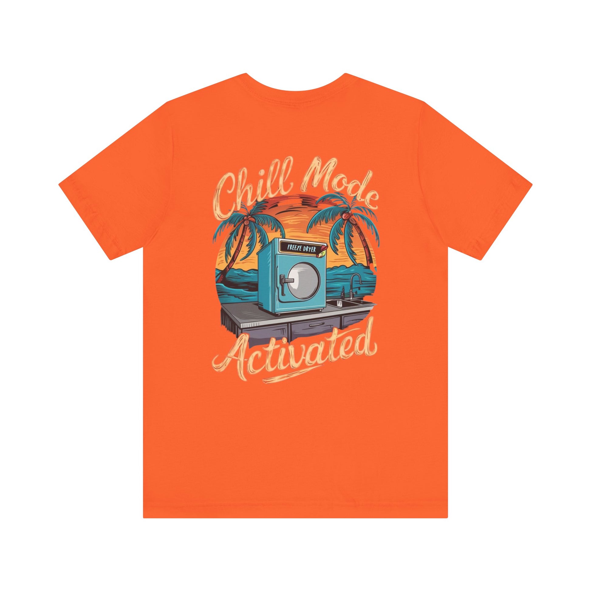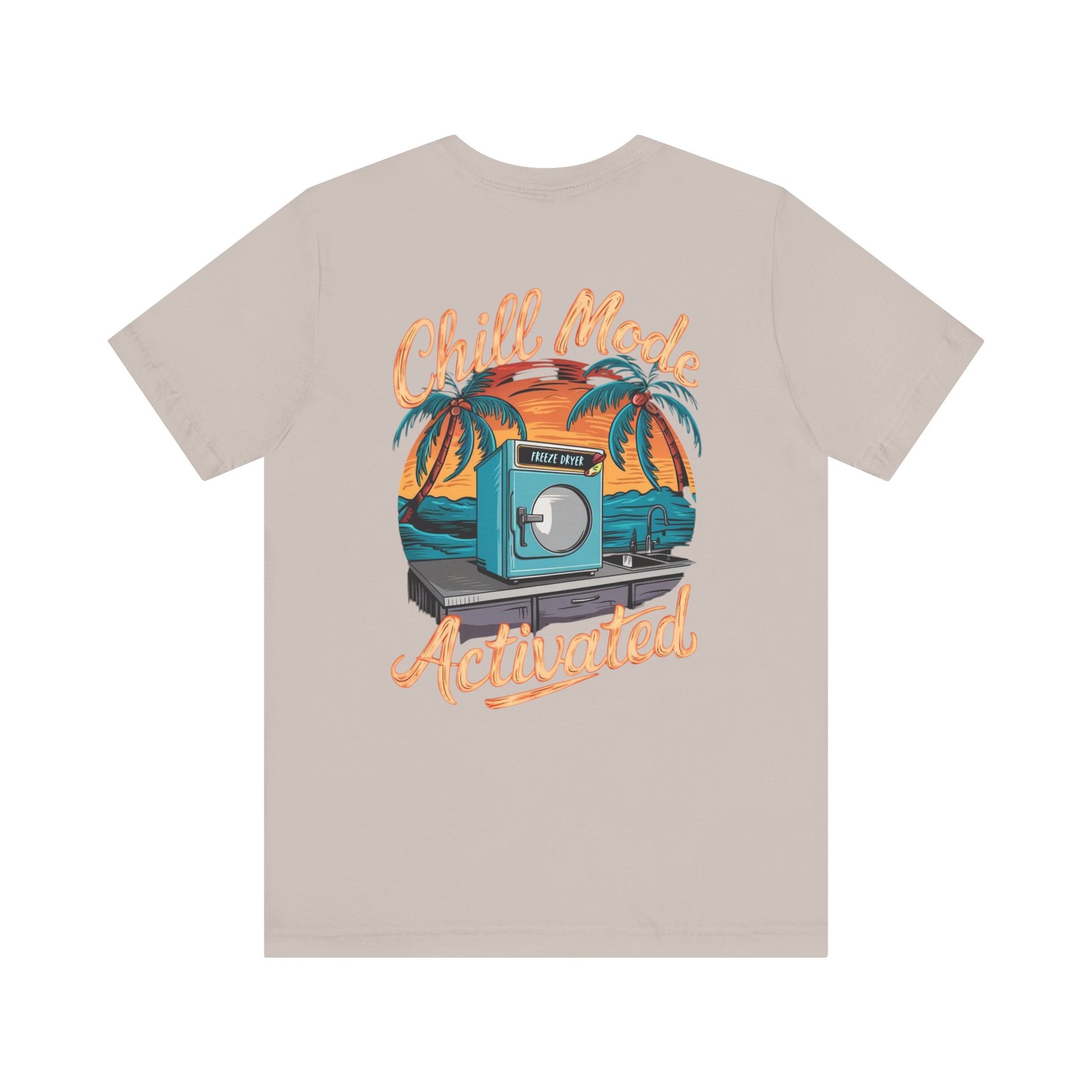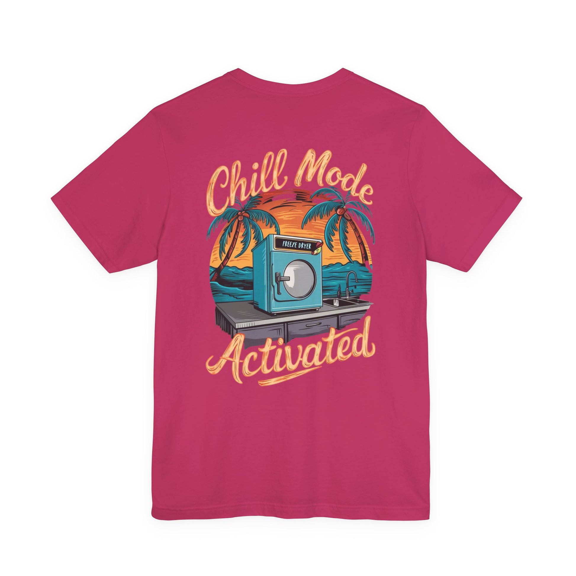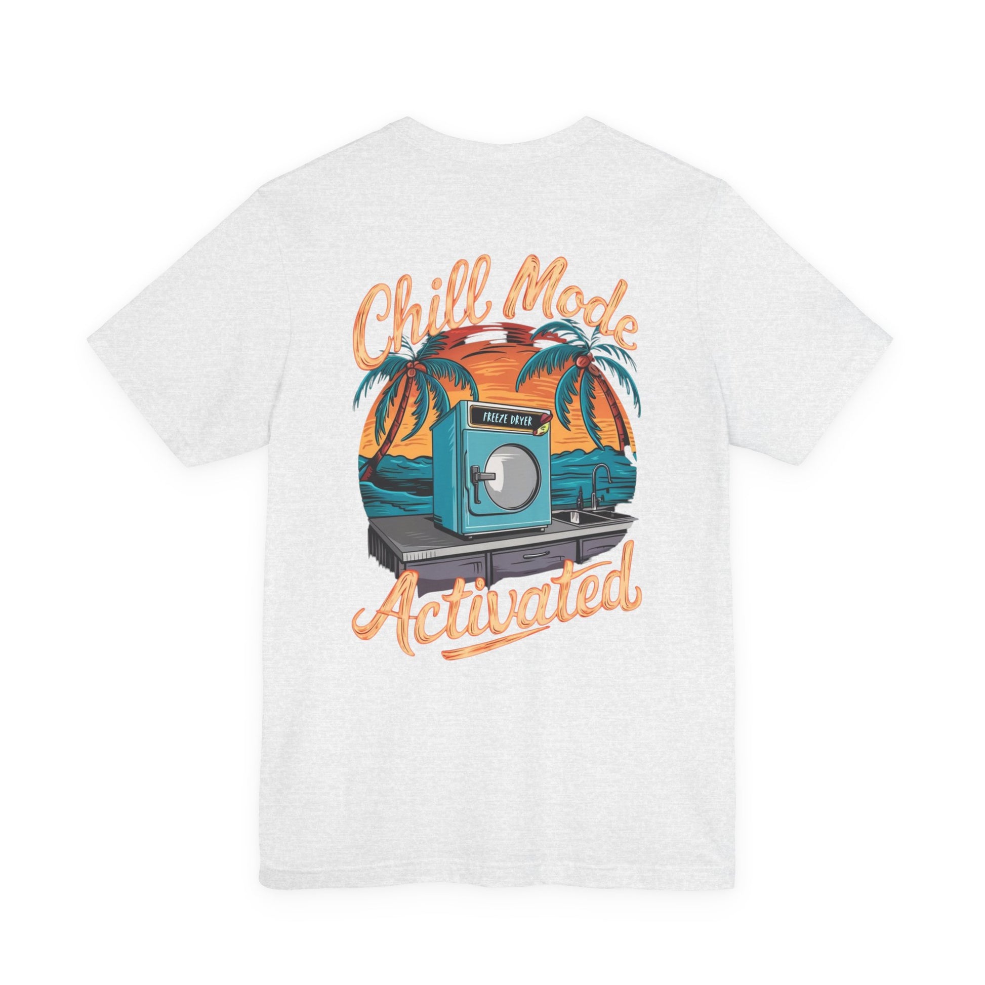 Stay cool and laid-back with this cleverly designed T-Shirt featuring a freeze dryer in a tropical setting, framed by the words, 'Chill mode activated'. Perfect for those who love quirky and unique designs, this T-Shirt is ideal for casual wear or as a conversation starter at gatherings and parties. Great for adults looking to add a fun element to their wardrobe, especially during summer or beach-themed events.