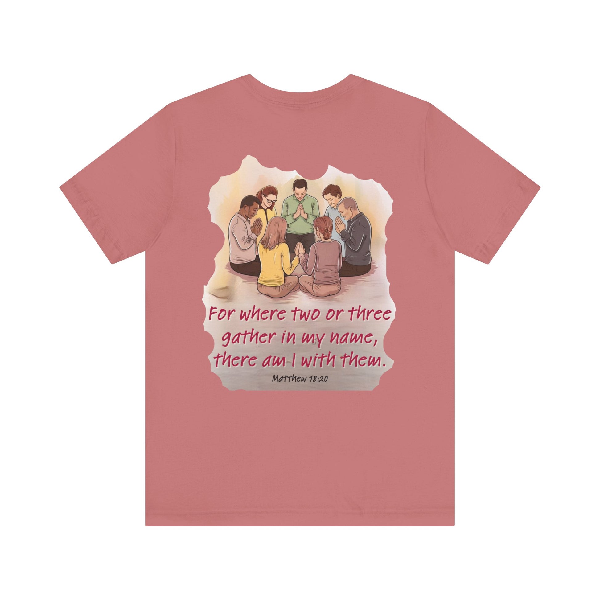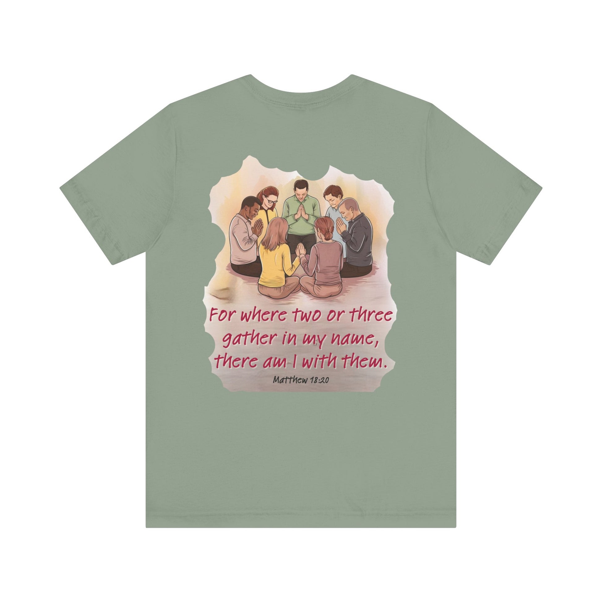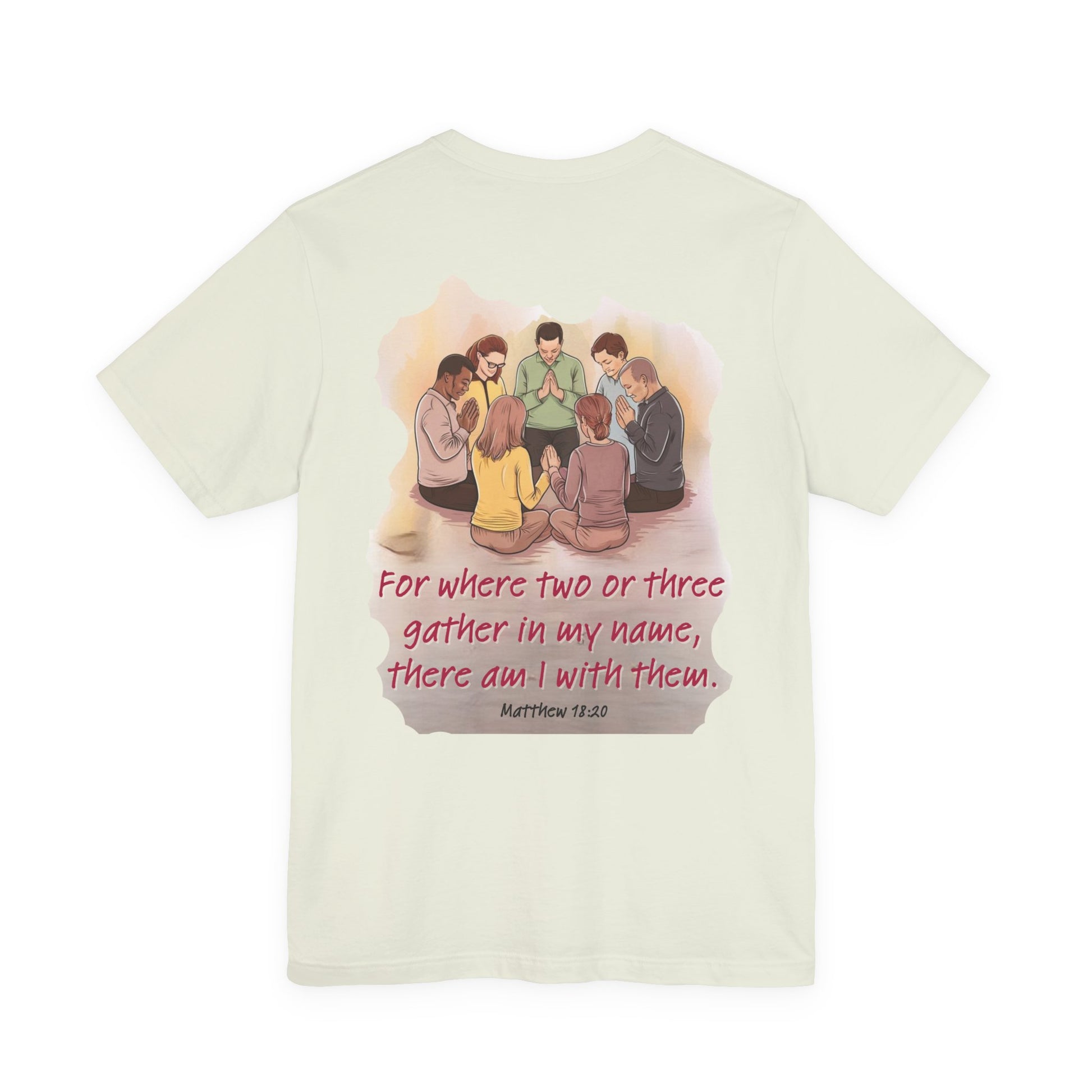 A T-Shirt featuring a group of people in a prayer circle with the bible verse Matthew 18:20 underneath. This T-shirt provides a sense of spirituality and connection, making it perfect for those seeking faith-based inspiration.