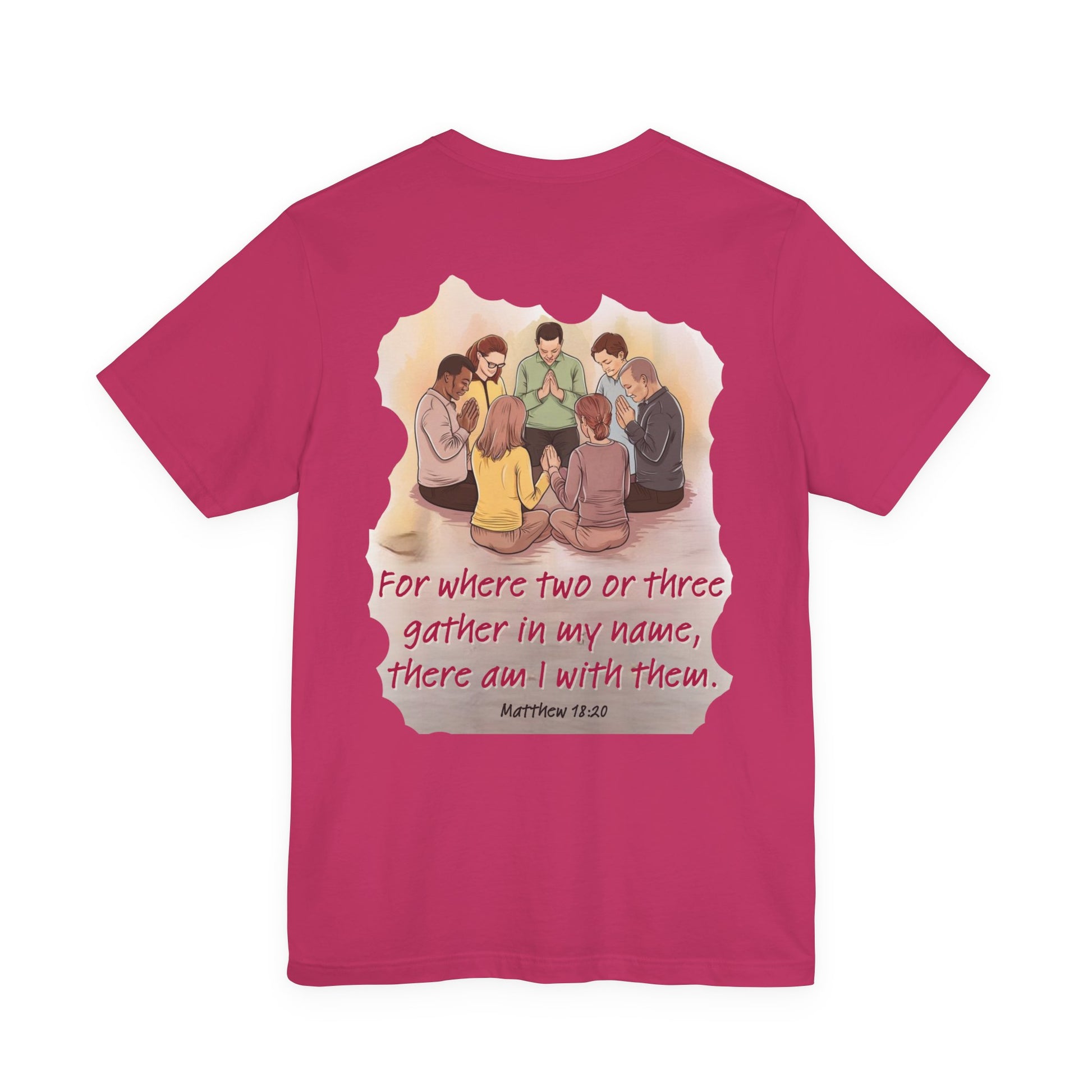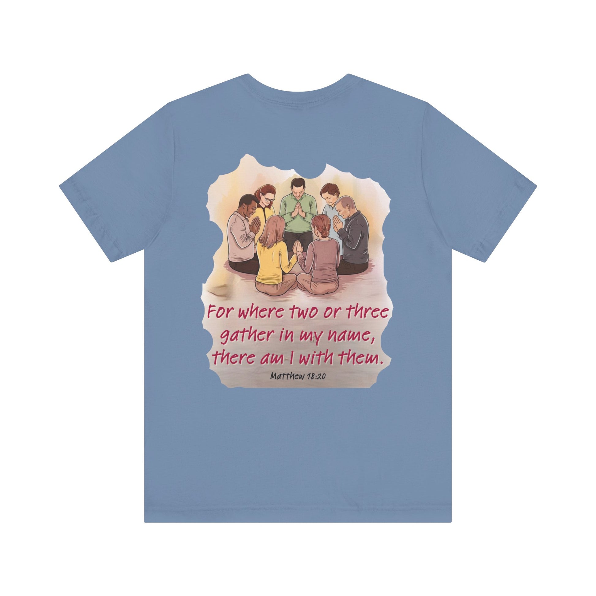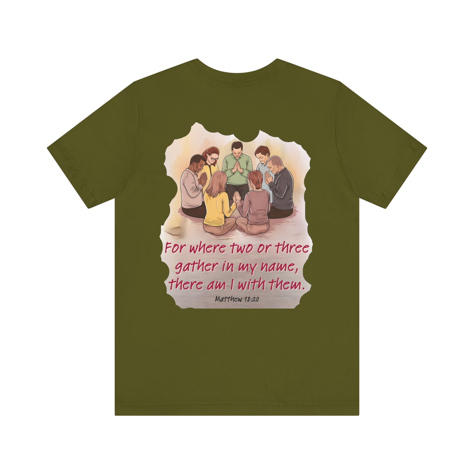A T-Shirt featuring a group of people in a prayer circle with the bible verse Matthew 18:20 underneath. This T-shirt provides a sense of spirituality and connection, making it perfect for those seeking faith-based inspiration.